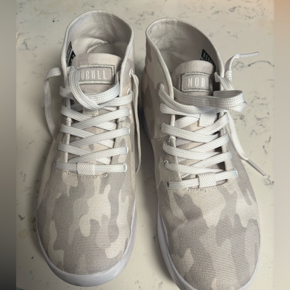 White camo canvas material. Worn a few times they are too big for me. Women size 7.5