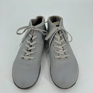 Cushioned, gray knit lace up mid-court athletic sneakers.