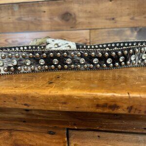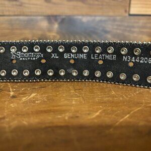 This is a quality belt by the Nocana Belt Co. The cowhide is a black and white/gray color. Studded with silver and diamond rhinestones. It is in new and excellent condition. The size is XL. I'm listing this under Women but I feel as though it is unisex. Thanks for looking!