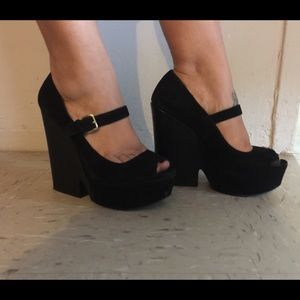 Black suede. A mix between a heel and wedge. Worn a few times but in good condition.