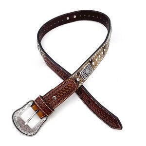 This genuine leather Nocona belt blends traditional Western style with bold detail. It features hand-tooled basketweave leather, a silver-tone floral buckle, and a standout panel of natural hair-on cowhide trimmed with rhinestone studs and engraved conchos.