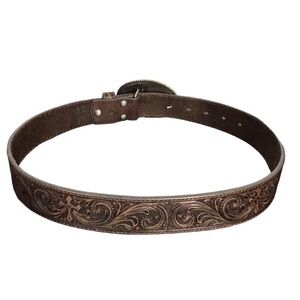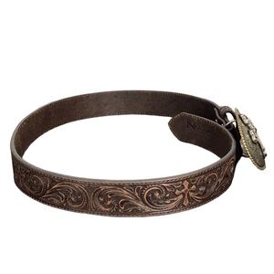 Nocona Embossed Brown Leather Western Belt Crystal Cross Buckle