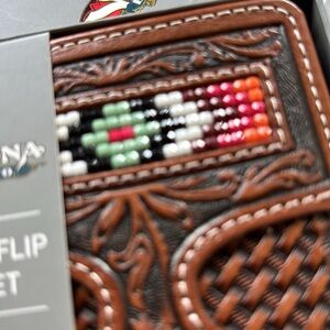 Nocona Tooled Leather,beaded diamond Aztec, Bi-Fold Flip,Western,slim fit wallet