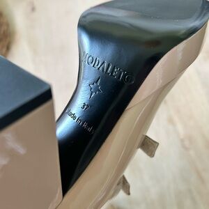 features: the bulla babies are an anthem to childhood and adolescence, pure yet mischievous, this shoe embodies a young lady who is sneaking out to go dancing; she changes her look but keeps her “babies” on, two leather straps fasten these heels, made in italy