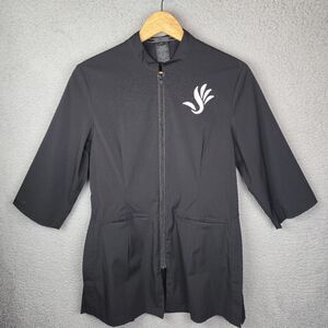 Upgrade your workwear with this elegant black Noel Asmar womens jacket top, crafted in a soft stretch blend for comfort and ease of movement. Designed with a modern collarless silhouette, front zipper closure, and sleek three-quarter sleeves with split cuffs, this piece features an embroidered white stylized swan on the chest for a subtle statement. The minimalist design, functional pockets, and semi-fitted waist make it perfect for hospitality, cosmetic counter, spa, or medical settings. In excellent condition with no visible flaws, this machine-washable jacket is a versatile addition to your wardrobe. Pair it with tailored pants or a sleek pencil skirt for a contemporary professional-ready look.