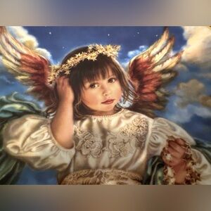 • Details: Features a charming angel child holding a garland under a starlit sky