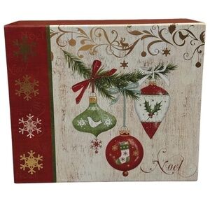 “Festive holiday gift box in perfect condition, featuring a beautifully detailed design with classic Christmas ornaments and a ‘Noel’ theme. The box is adorned with a red bow on the front and decorated in traditional holiday colors of red, green, and white. The sturdy, hard cardboard construction ensures durability, making it ideal for gifting or storing holiday treasures. This never-used box adds a touch of elegance and charm to any holiday celebration, perfect for those who appreciate a classic, vintage-inspired Christmas aesthetic.”
