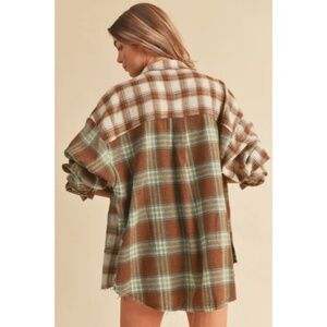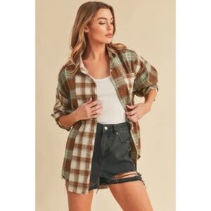 Noelle Brown White Sage Oversized Flannel Button Patchwork Long Sleeve Shirt