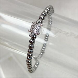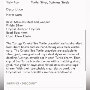The Tortuga Crystal Sea Turtle bracelets are hand-crafted from 4mm beads and are hand-strung on a clear elastic cord. The Crystal Sea Turtle bracelets are available in silver, gold, rose gold and onyx steel styles with rows of dazzling Austrian crystals set in each Turtle charm. crystal Sea Turtle bracelet with a matching silver logo charm. With their stretchable clear elastic cord, the Crystal Sea Turtle bracelets are one-size-fits-most.