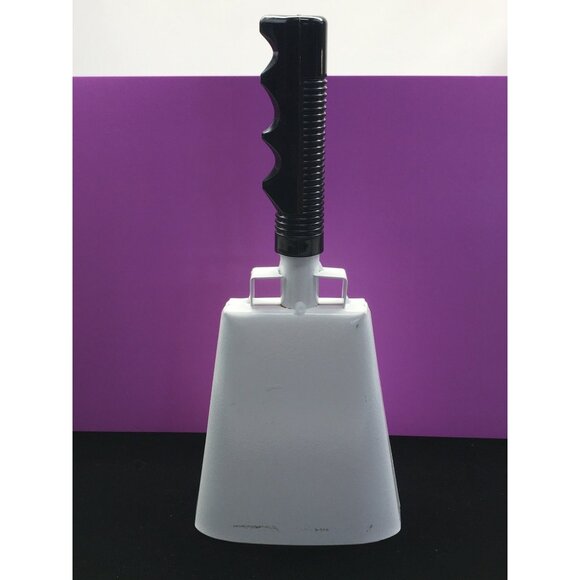 Noise Maker Cow Bell White Metal Bell Black Plastic Handle 10” Tall