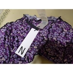 "A blurred bloom print enlivens this gauzy mesh top designed with curly lettuce trim.