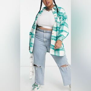 Faux wool shearling jacket with front pockets in green check with pink line detail