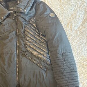 Elegant black puffer coat by Noize. Features a hood and quilted accents. Perfect for warmth and style.