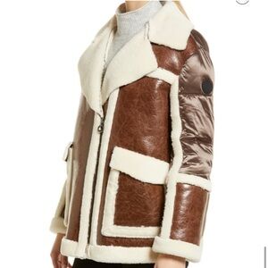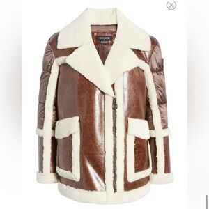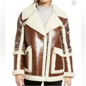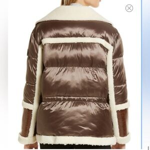 Plush faux-fur trim traces the edges of a glossy mixed-media jacket that pairs high-sheen faux leather with puffy, quilted sleeves.