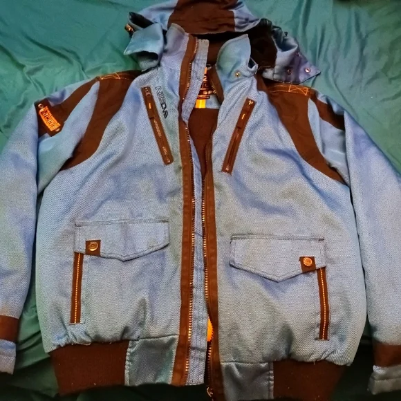 Blue with black trim. snowboarding / skiing. size large. coat is a little dirty but not in bad condition. it's super warm and blocks out the wind great.