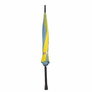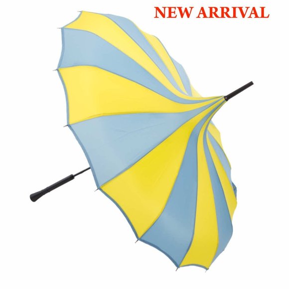 Light Blue and Yellow alternating 16 panel pagoda-style umbrella. Perfect for daily use, special occasions and gifts. Second line down the streets like you would in New Orleans with this unique and beautiful parasol. Features include waterproof fabric, manual open and close, metal frame and shaft, nickel tips, custom designed wooden engraved handle. Colors: light blue and yellow, Closed Length: 34 in., Open Diameter 36 in.