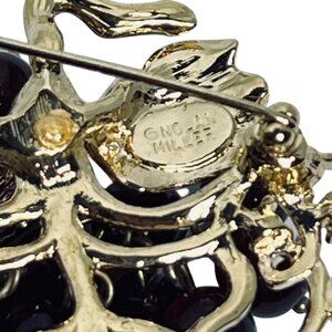 This exquisite vintage brooch from the Nolan Miller Glamour Collection features a cascading cluster of deep burgundy lucite grapes, accented with sparkling clear rhinestones. Crafted with a gold tone finish, it embodies elegance and sophistication. This piece serves as a graceful nod to timeless style and is a beautiful addition to any collection.