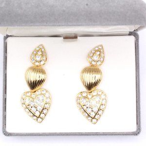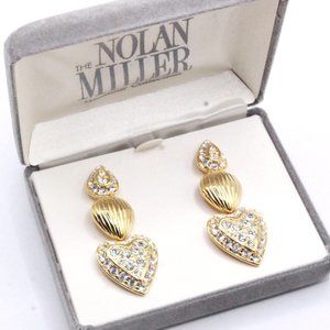 Indulge in the timeless elegance of these designer earrings by Nolan Miller, a rare find of New Old Stock. These dangle earrings are meticulously crafted from gold tone metal, featuring a stunning three-part design. The tear drop, almond, and heart shapes delicately cascade from one another, creating a captivating visual appeal. The tear drop and heart-shaped bases are adorned with sparkling pave rhinestones, while the center boasts a sleek almond surface. Marked with the signature "NOLAN MILLER," these earrings are a testament to the designer's exquisite craftsmanship. Accompanied by their original box, these earrings are in mint condition and come with a pierced butterfly backing for comfortable wear. With a length of 2 1/4" and 3/4" wide, they add a touch of sophistication and glamour to any ensemble.