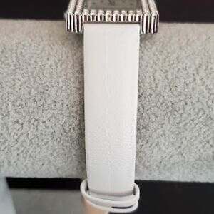 Nolan Miller women's watch is 1 inch square with a mother of pearl face and crystals on the bezel. White leather band shows minimal wear from being latched during storage. Excellent condition. Currently running with a fresh battery.
