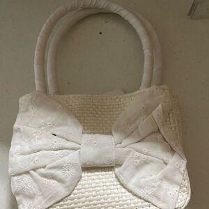 Beautiful small white straw tote with white bow on front