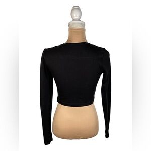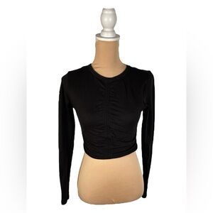 This chic black crop top features long sleeves and a stylish ruched design. Perfect for a night out or a casual day, it offers both comfort and elegance.