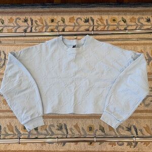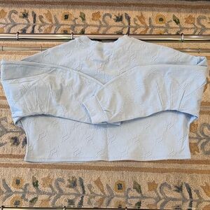 Chic light blue top with subtle textured design. Ideal for everyday style. Really nice fabric. Boxy style cropped fit. Goes well with leggings