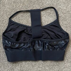 Stylish black faux leather sports bra with a unique back design. New without tags