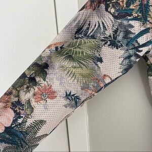 Features: long sleeves, graphic floral print, limited edition Collab piece, full zipper front, front pockets, lightweight, Victorian pattern, tropical leaf, lined, sporty, stretch