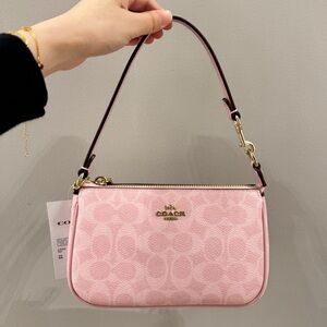 Chic Coach shoulder bag in light pink. Features signature pattern and gold accents. Ideal for everyday elegance.