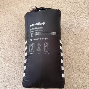 Cozy puffer blanket. Stylish black and gray design. Perfect for warmth and comfort.