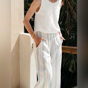Absolutely beautiful pant, new with all tags attached and chic nomad fabric tote. The size is Australian XXS corresponding to US 2. Completely sold out in this size and most other on website. I’m selling other nomad pants as well if you’re my size and style 🌸Embrace laid-back luxe with the Del Mar Linen Wide Leg Pants, made for ultimate comfort. The subtle, blush stripe against the ivory linen and rayon blend creates a chic aesthetic. With a semi-elasticated waistband and a high-rise design, these pants are figure-flattering and pair perfectly with our Alba or Corfu Top.