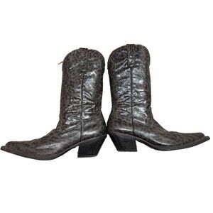 Nomad Sunline cowboy boots in size 8. Edgy dark olive green and black shiny leopard animal print. Classic Western styling with pointy toe, mid-calf height, pull on straps, and 2.5 inch block heel in a bold modern print. Western lifestyle paired with boho fashion perfect for weekend parties, festivals, and everyday statement wear.
