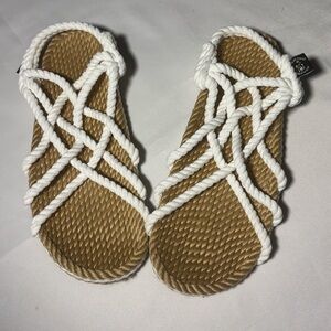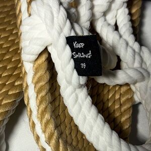 Stylish rope sandals with a white and tan design. Perfect for casual outings. Like new. From a smoke free home.