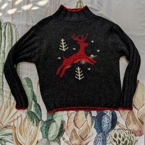 Nomadic Traders Black, White & Red Silk & Angora Blend Christmas Reindeer Knit Mock Neck Sweater