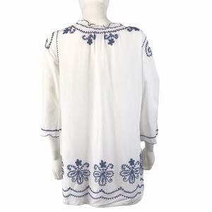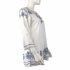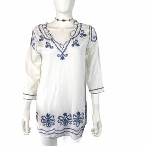 Nomadic Traders Fresco Embroidered White & Blue Tunic V-neck Blouse