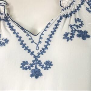 Nomadic Traders White & Blue Blouse Boho Embroidered Flowers Peasant Top
