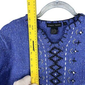 Nomadic Traders purple sweater women's knitwear silk blend geometric pattern embroidered sweater beaded accents cozy fashion winter wear stylish knit unique design warm material elegant clothing