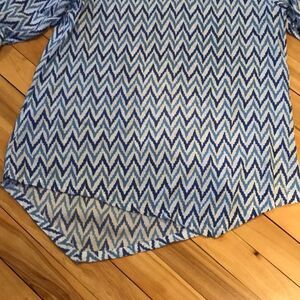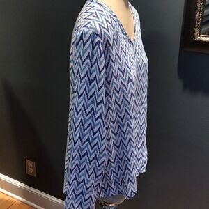 Nomadic Traders shades of blue on white chevron print top. Banded V neckline. Long sleeves. Asymmetrical hem front and back that creates V on left in front; V on right in back- see last photo. 100% rayon. Size small. New, no tags. Nonsmoking home.