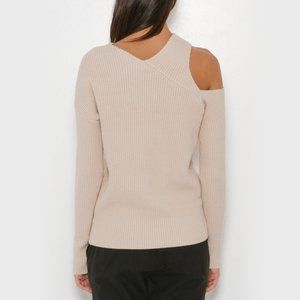 Nomia Asymmetrical Sweater in Ecru. Beige rib knit sweater in thick viscose blend with asymmetric cut-out detail at shoulder. Long sleeves, slight v neck cut, drop shoulder with cut-out detail. Straight silhouette, fits true to size. Pull on. 65% viscose, 35% nylon. Nomia is a small New York City brand.