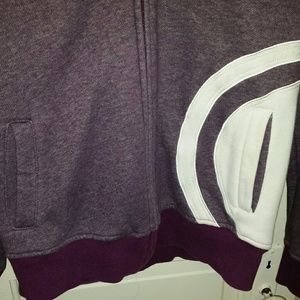 Warm purple hoodie with white nomis logo wrapped on the left side. Dark purple cuffs and bottom.