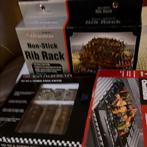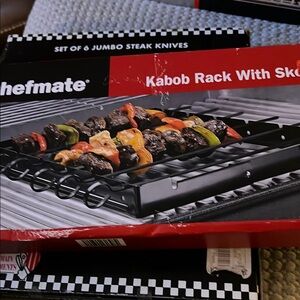 Enhance your grilling experience with the Non-Stick Rib Rack. Its elegant black finish ensures even cooking and easy cleaning, perfect for barbecue lovers. Plus, 7 piece chef mate set, Kabob Rack With Skewers, and a set of six jumbo Steak Knives, The Main Ingredients