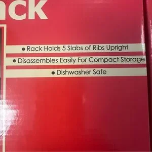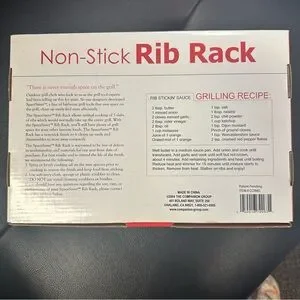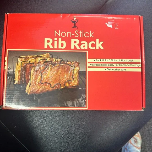Non-stick rib rack for grilling. Holds 5 slabs upright. Easy to disassemble and store. Dishwasher safe.