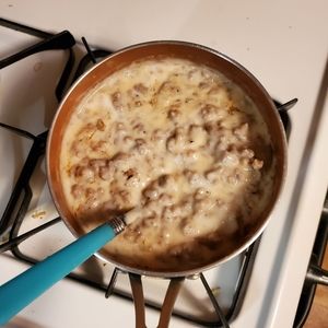 Homemade sausage gravy, Jimmy Dean breakfast sausage crumpled up fried down no grease, combine into white gravy