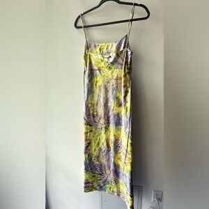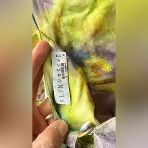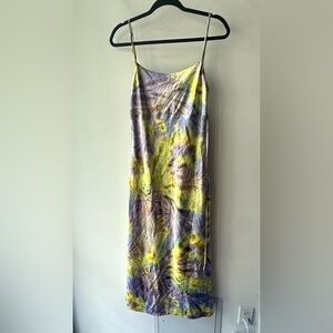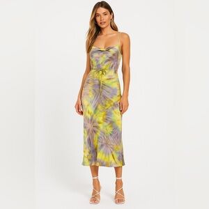 flynn skye jackie slip dress spiral mist midi tie dye spaghetti strap watercolor stretch bias cut unlined purple yellow green size s 802