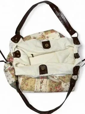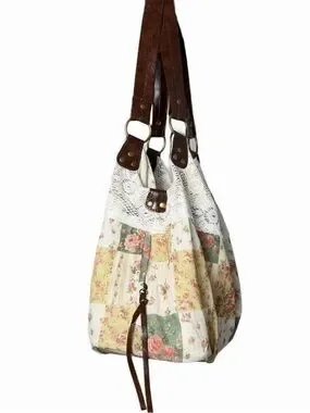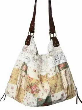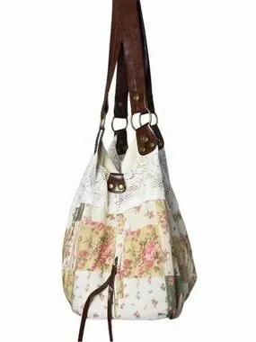 Boho floral patchwork lace tote bag with brown faux leather straps & lace trim. Romantic patchwork florals create a garden fairy / indie western vibe perfect for everyday wear, festivals, or Coachella.