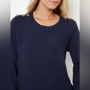 Stylish navy sweater with button details on the shoulders. Perfect for a casual or dressy look. Soft and comfortable material.