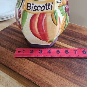 Nonnies hand painted ceramic cookie jar with purple top fruit motif