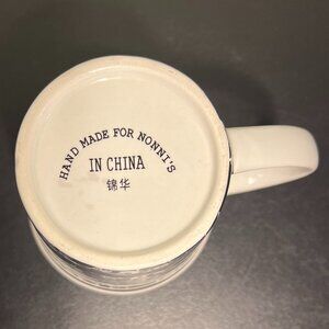 This perfect mug for enjoying the classic pairing of coffee with a biscotti features an exquisite Art Nouveau wrap-around white on black scroll pattern. White cursive text between raised double ribbing reads, Nonni’s Biscotti. White interior and white, large comfortable easy-to-grip handle. Measures 4.5” tall with a 3.75” diameter; 5.25” across including handle. Holds 16 fluid oz