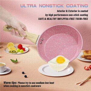 🧿Eco-Friendly Non-Stick Coating: Pink non-stick granite coating, which is great for preventing food from sticking, non-toxic, 100% PFOS and PFOA free, ultimately frees food to ensure your everyday cooking is always safer and healthier. You can safely cook acidic or strong-smelling ingredients in granite stone cookware without changing the taste and smell of your food.