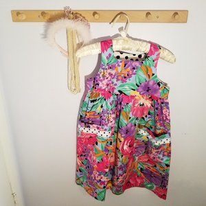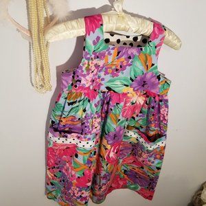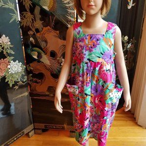 This is a lovely blue pink flowered girls sleeveless dress. Made by "Noodles" this size 6X cotton dress has a light blue background with pink, purple and orange Monet style flowers pattern on it. It has a square neckline is sleeveless. Has two large pockets in the front with white polka dot ribbon trim. It is below the knee length and unlined. Lovely quality dress for a spring,party or summer time! It has a cloth tag attached, "Noodles, Size 4-6X".
